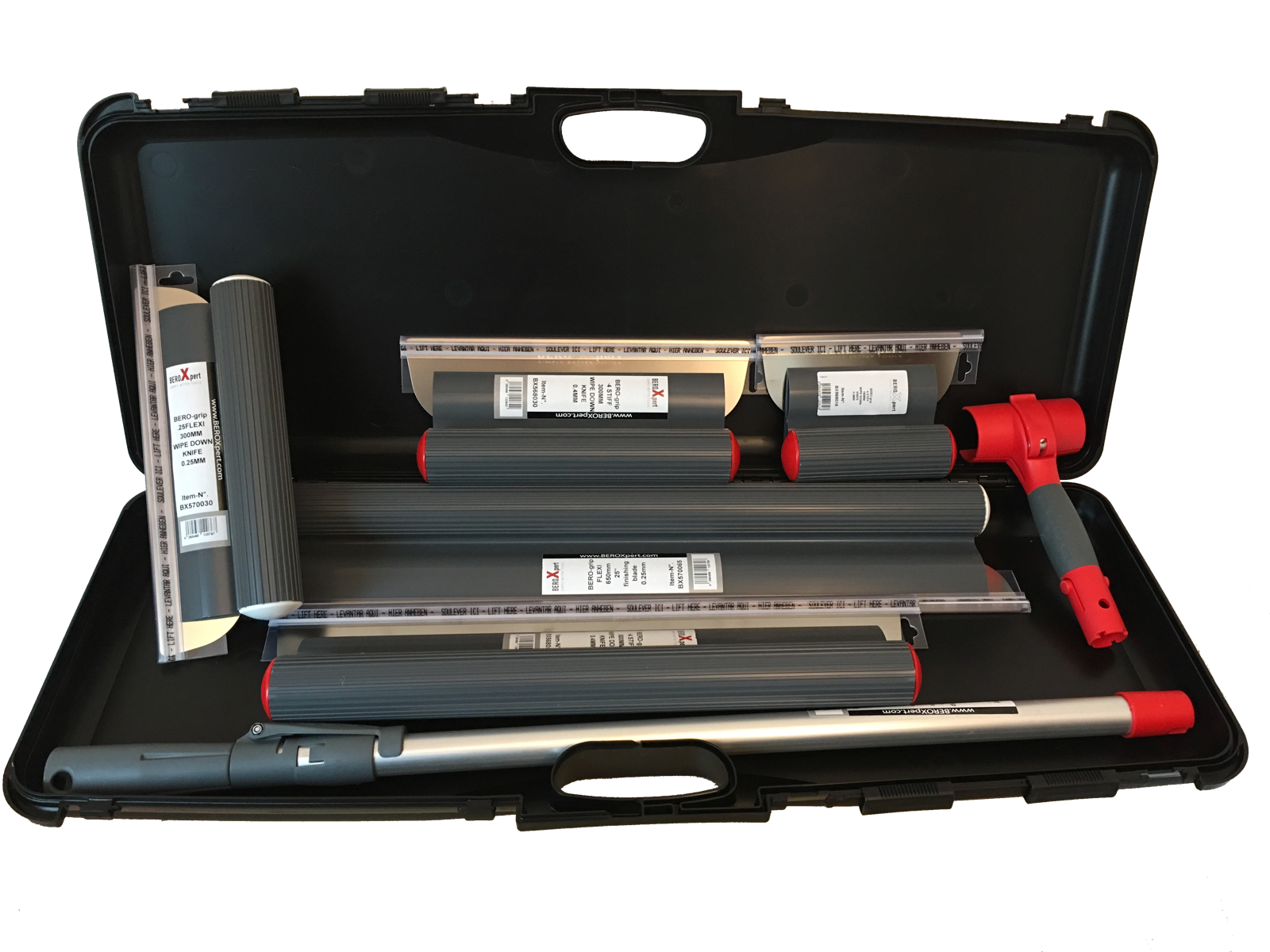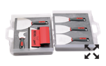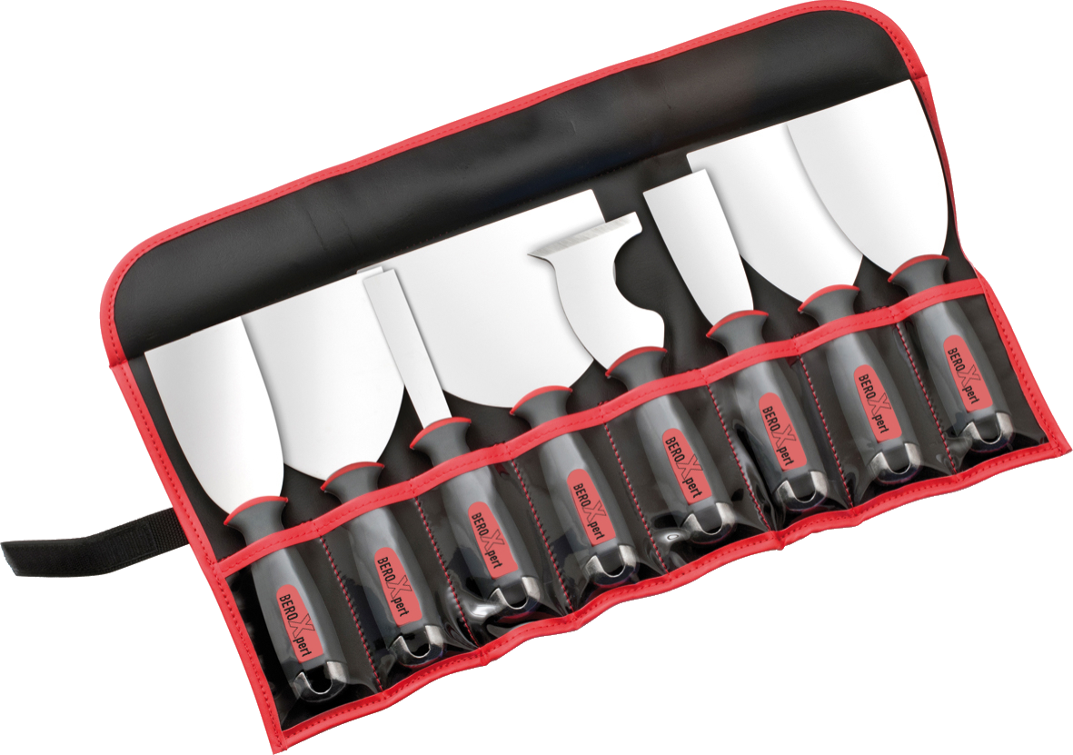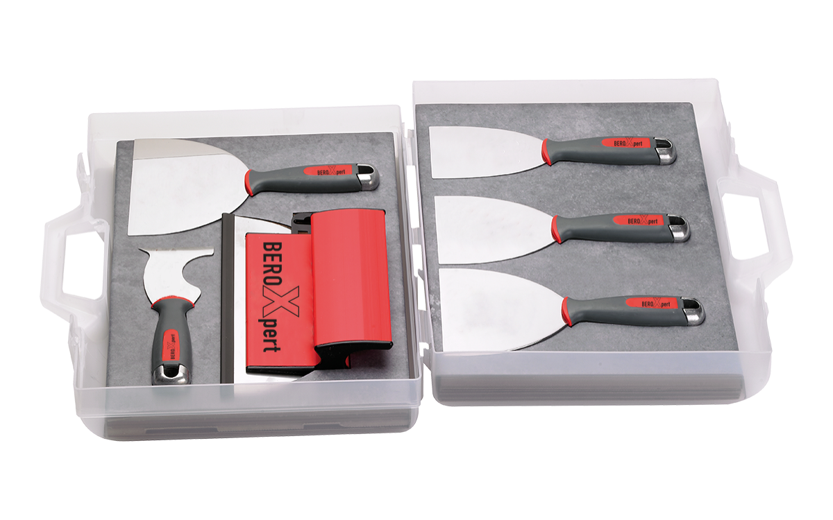 are the highest Standard for premium wipe-down and finishing knives. Featuring advanced engineering and the highest grade INOX German stainless steel, BEROXpert™ blades/ knives produce the absolute best finish in the drywall industry. The secret is the strong but flexible INOX blade and the precise fulcrum point designed into the grip area. This allows the blade to have up to ten times more contact area with the surface, generating a superior finish. The ergonomic design is comfortable even with extended use and significantly reduces the wrist strain that is common when using traditional finishing knives. The knives are easy to use with one hand or two.